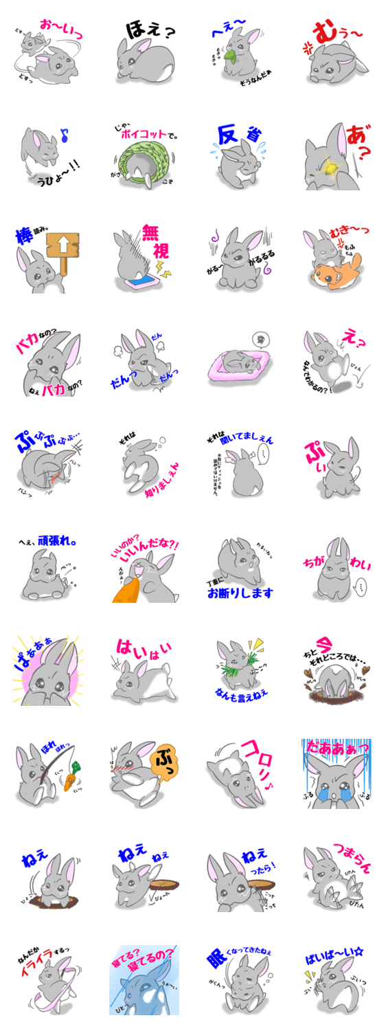 虫の居所がちょっぴり悪い、灰色うさぎのろっぴが会話のお手伝い。毒っぽい事もいうけど、ホントはそんなにおこってないよ♪着せかえと同じデフォルメテイストです。