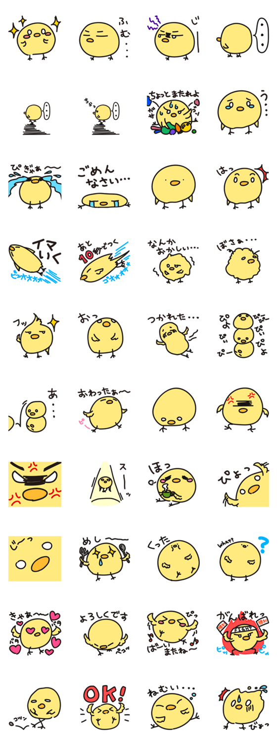 | スタンプ説明 | ゆる〜いスタンプ。 ちびぴよといいます。 たまに違う生き物にみえますが、正真正銘ヒヨコです。 |