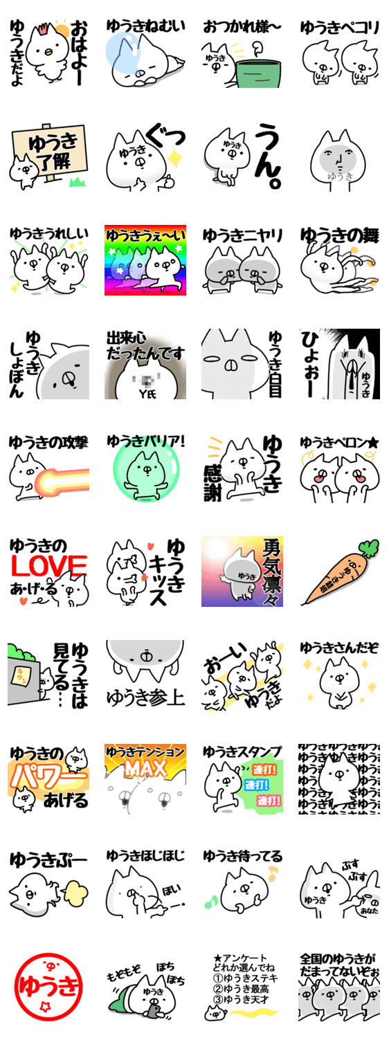 ゆうき、ちゃん、さん、君(くん)が使える、ゆるい名前/あだ名スタンプ。ユウキ/有希/勇気/結城/優木/優希/祐希/佑樹/裕貴/有紀/悠木専用、可愛い、ねこ。送ると面白い。