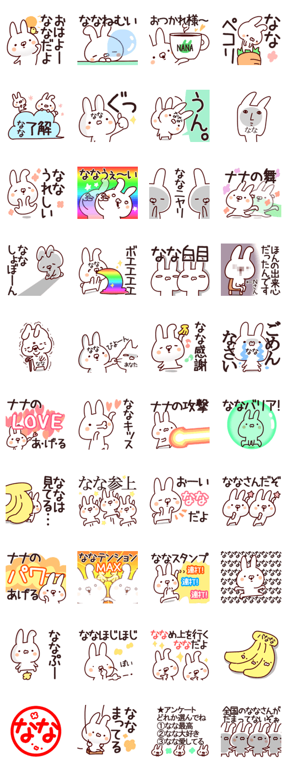 なな、ちゃん、さん、が使える、ゆるい名前/あだ名スタンプ。ナナ/nana/ななみ/ななこ/ななか/ななえ/ななよ/ななり/ななと/なな専用可愛い、うさぎ。送ると面白い。