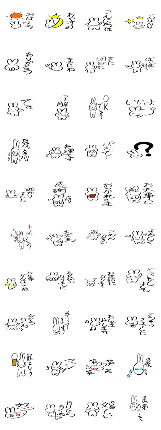 筆ペンで書いたシンプルなウサギの日常に使えるスタンプです。