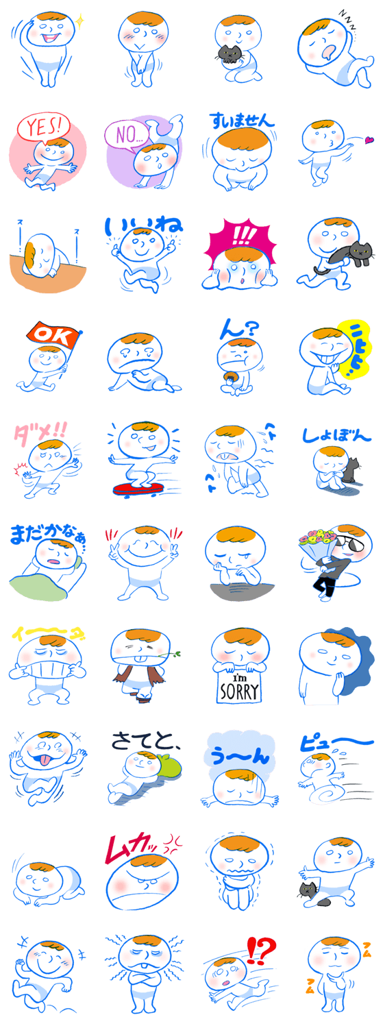 のんびり屋さんでお調子者の赤ちゃんおむつぼうや。表情豊かなおむつぼうやと黒猫クロエのまったりスタンプをおたのしみください!