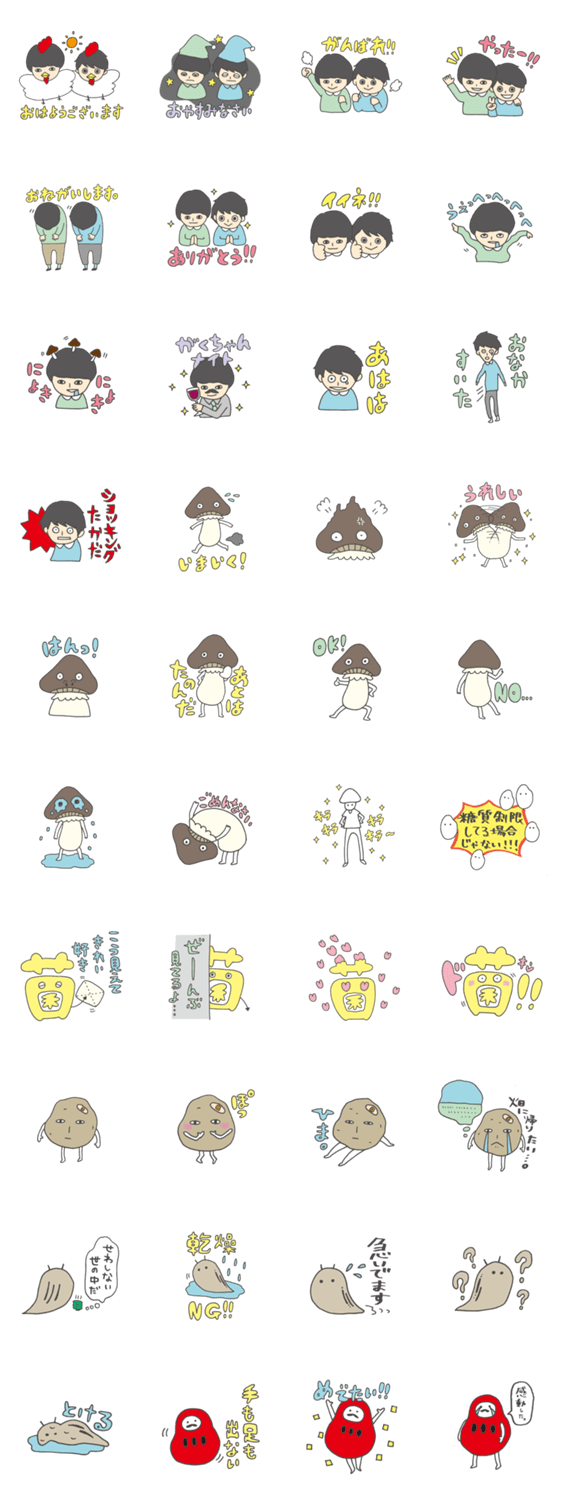 | スタンプ説明 | さくらしめじとその2人をとりまく 愉快な仲間たちのスタンプです。 おためしあれ〜。 |