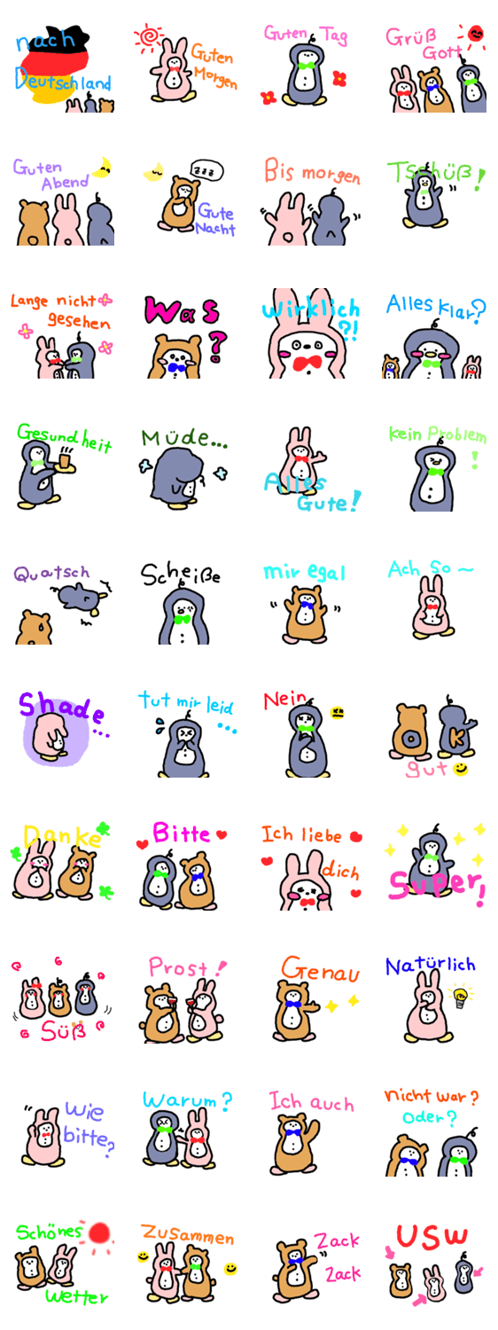 ドイツ語を話す森のともだち?のくま?うさぎ?そしてなぜかペンギン?!日常で使えるスタンプだよ!ドイツが好きなともだちやドイツ人のともだちに送っちゃおう!