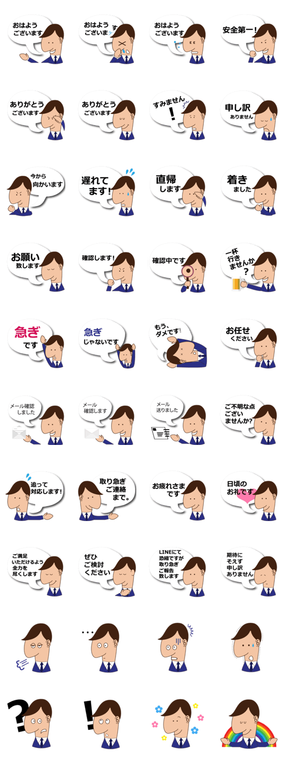 | スタンプ説明 | ビジネスメール効率化。ビジネスメールに特化したお仕事スタンプ。 実際の業務にご活用いただけます。 |