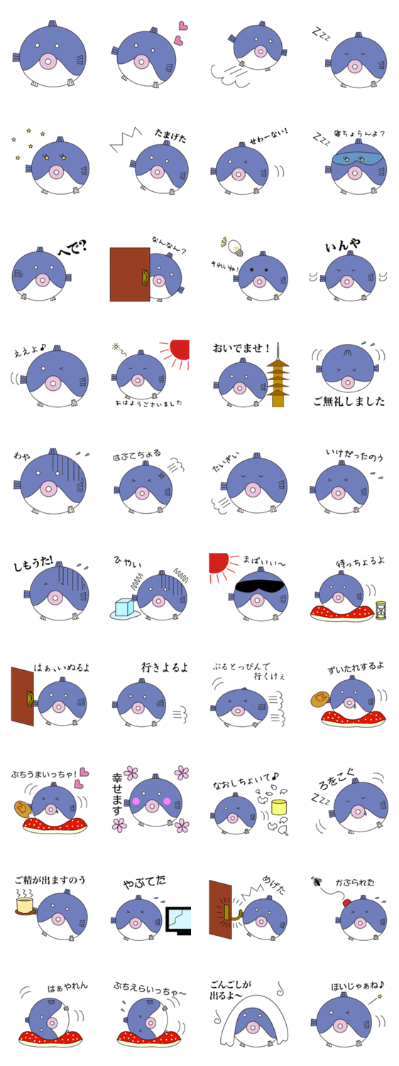 | スタンプ説明 | ふぐの「ふぐっち」は生まれも育ちも山口県。流暢な山口弁を話します。 |