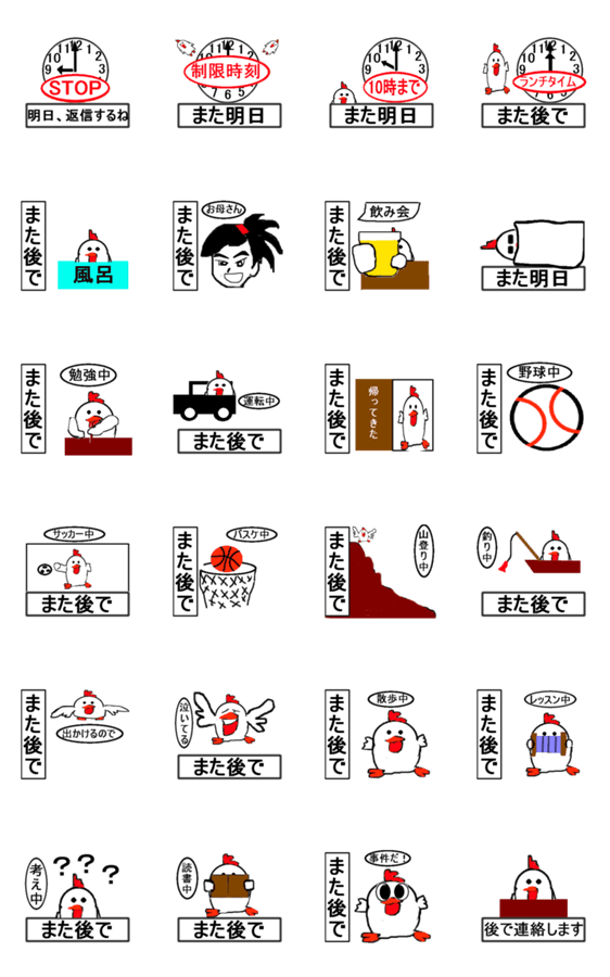 直ぐに返信できない、今日は返信できない時などに気まずくならないように使うスタンプです、また後で、また明日など
