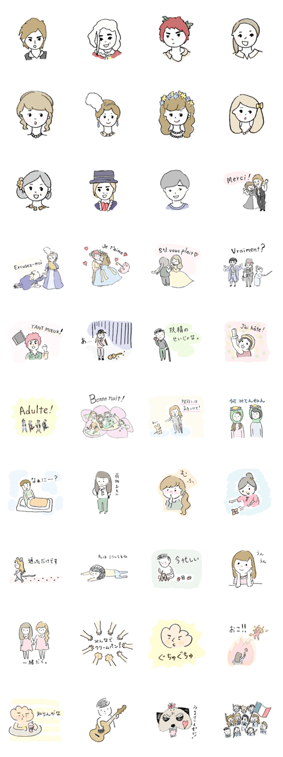 フランス語研究会(フラ研)のスタンプ。衣装をまとったり、フランス語を話したり、フランスが大好きなフラ研メンバーの個性豊かな楽しいスタンプです。