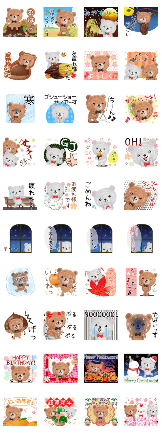 秋冬用のクマのぬいぐるみのスタンプです。日常でよく使う言葉や相槌を中心に、誕生日,クリスマス,ハロウィン,年賀状,バレンタイン等のイベント用挨拶等も入れてます♪