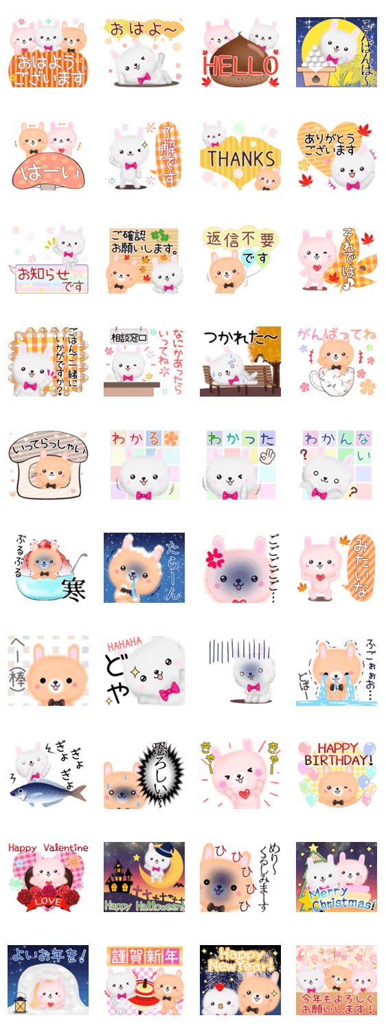 主に秋冬用の可愛いウサギ達のスタンプです。日常でよく使う言葉や相槌を中心に、誕生日,クリスマス,ハロウィン,年賀状,バレンタイン等のイベント用 挨拶等も入れてます♪