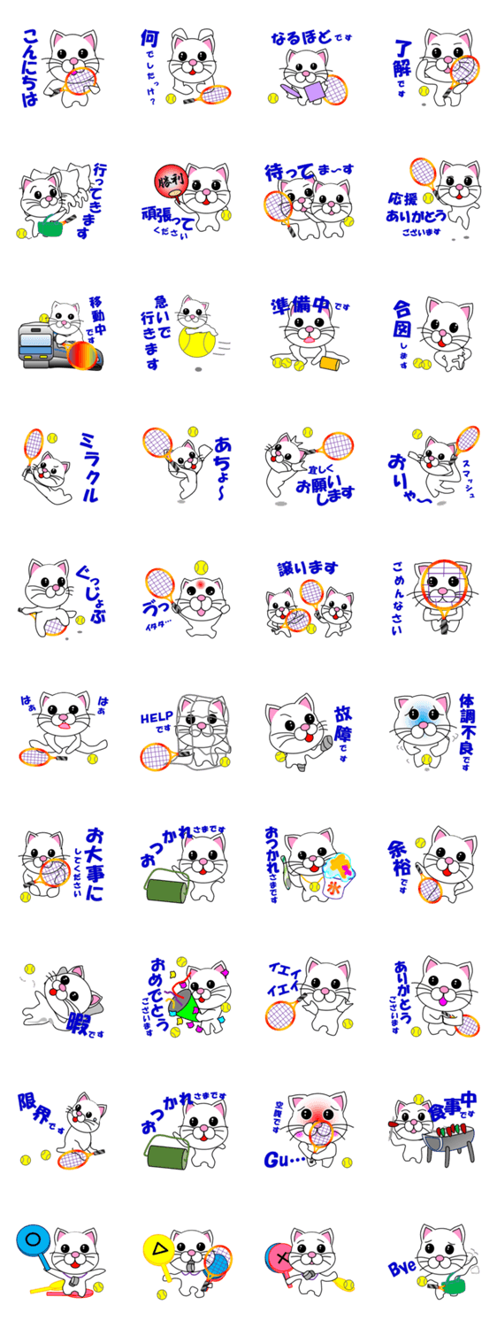 | スタンプ説明 | テニスをする白い猫で会話するスタンプです。練習や試合、日常会話に使えるスタンプです。 |