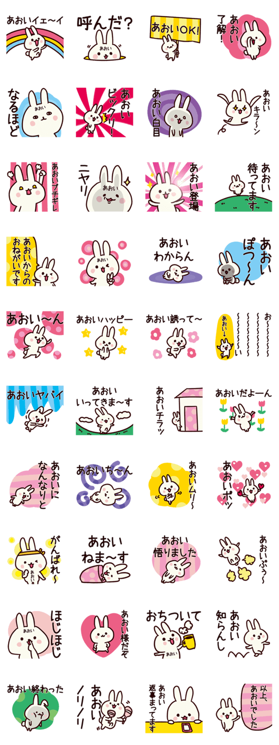 名前が[あおい][アオイ]さんが使うと楽しい名前スタンプです。葵,碧衣,葵衣,蒼衣,青井さんなどの専用スタンプなので盛り上がります!あおいちゃん専用スタンプです。