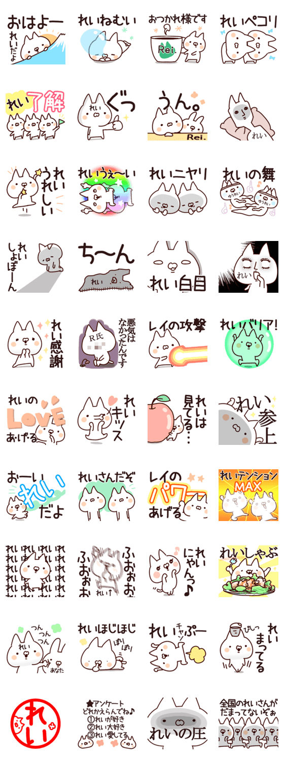 れい、ちゃん、さん、が使える、ゆるい名前/あだ名スタンプ。レイ/れいこ/れいか/れいな/みれい/れいじ/れいら/玲子/麗子/麗華/礼子/専用かわいい、ねこ。送ると面白い。