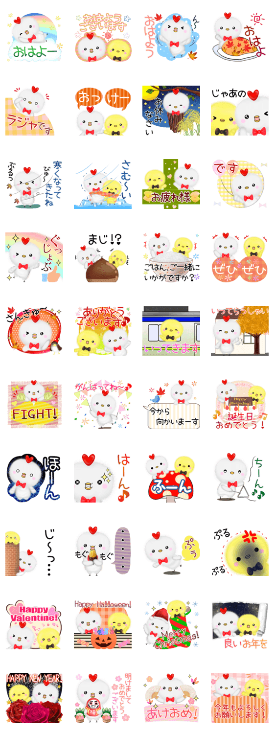 主に秋冬用の可愛いニワトリとヒヨコのスタンプ。日常でよく使う言葉や相槌を中心に誕生日,クリスマス,ハロウィン,年賀状,バレンタイン等のイベント用挨拶等も入れてます♪