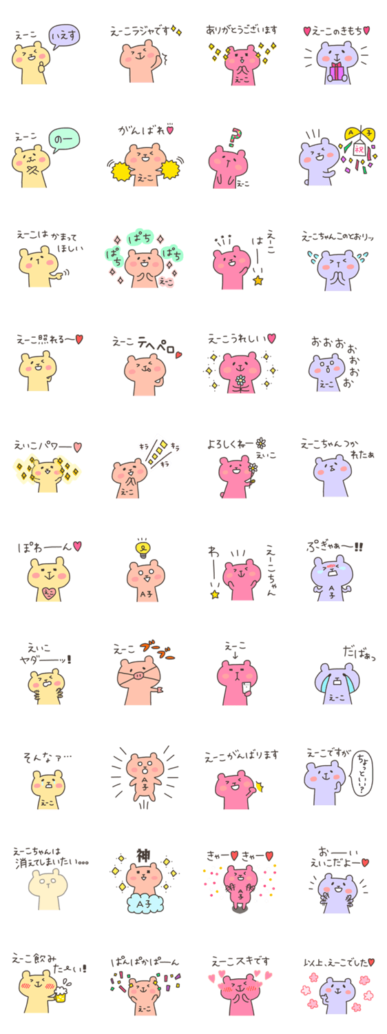「えーこちゃん」専用スタンプです。全国の栄子ちゃん、瑛子ちゃん、英子ちゃん、A子、えいこ、えーこに贈ります。この色合い個人的に結構好きです。