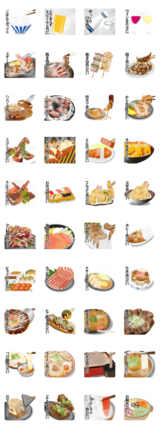 いますぐにでも食べたいモノをスタンプにしてみました!このスタンプで仲間を集めてみんなで美味しいモノを食べに行こう!!