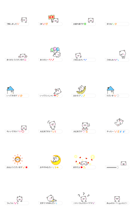 | スタンプ説明 | 「ぜんりょくまさん」の全力じゃない方のくまの吹き出しスタンプです。 文字が入力されていくふきだしが可愛い! 日常会話でよく使う言葉をまとめてみました。 |