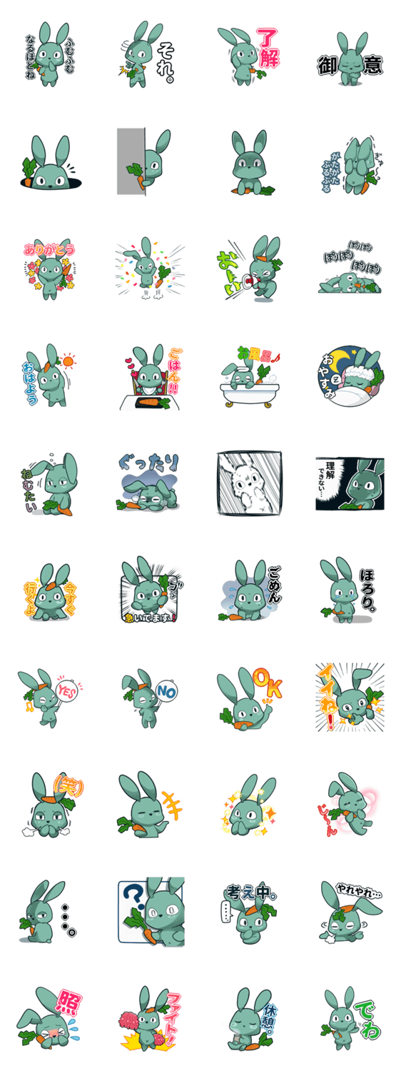| スタンプ説明 | 使いやすいスタンプ第2弾!冷静なうさぎのキャラクターのスタンプです。 コミュニケーションや日常会話に使い勝手の良いスタンプとなっています。 |