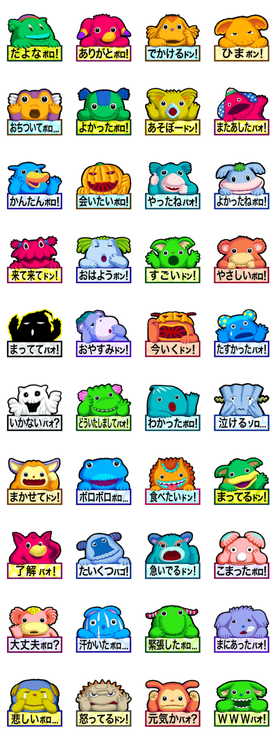 | スタンプ説明 | 「伝言モンスターズ」第一弾です。カワイイモンスター達があなたの代わりに伝えます。 |