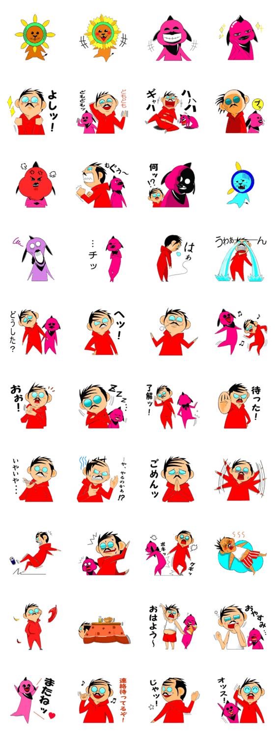 ライオン?ひまわり?謎の生き物が新たに加入。おっさんと妙な着ぐるみが引き続き登場。相変わらずヘンテコなスタンプです。