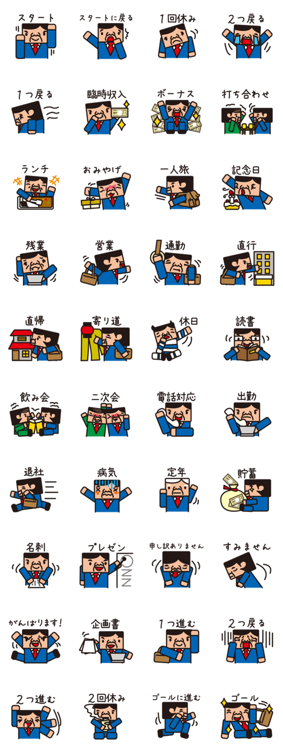 サラリーマンスタンプです。すごろくのように送ってゲーム感覚でゴールを目指したり、用件によって送ったり、いろいろな使い方ができます。