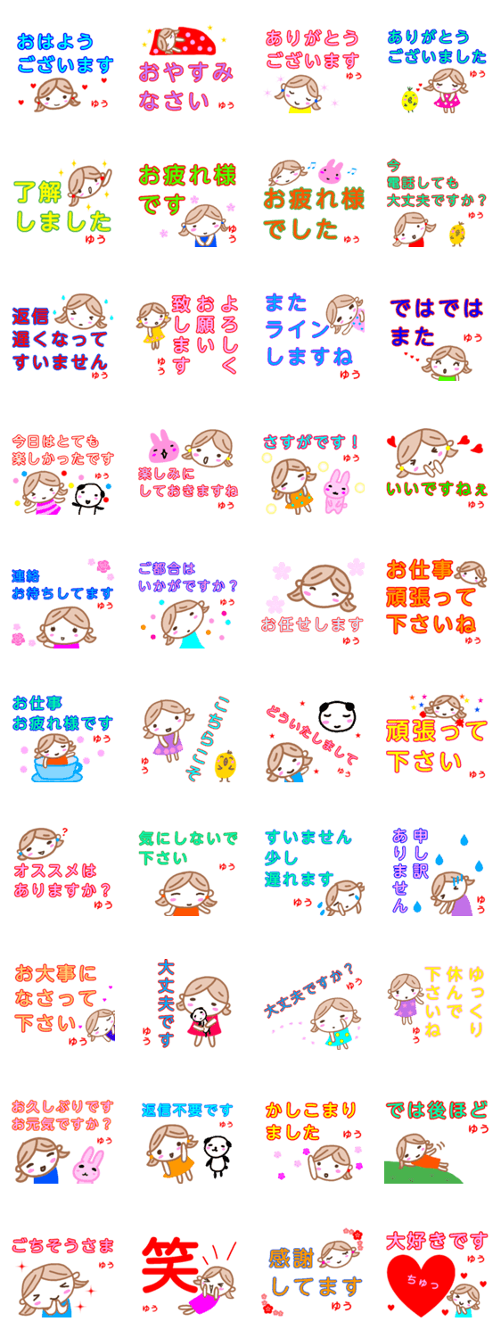 ゆうちゃん、さん(ゆう、ゆうこ、ゆうか、ゆうき)が使う敬語スタンプのデカ文字バージョンです。 ゆうちゃんへのプレゼントにもどうぞ。