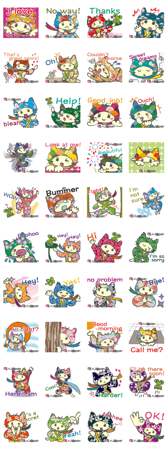 | スタンプ説明 | 忍×J@panシリーズ待望のスタンプ!世界で人気の『忍者×和柄』を着た忍者猫ちゃん。いつでも誰とでも使えるからとっても便利!世界中で使ってね! |