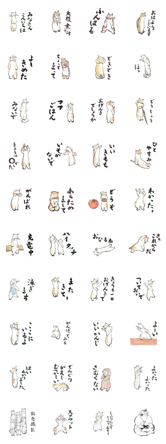 素朴なやさしい画風で猫たちをスタンプにしました。ほっこりしてもらえるとうれしいです。