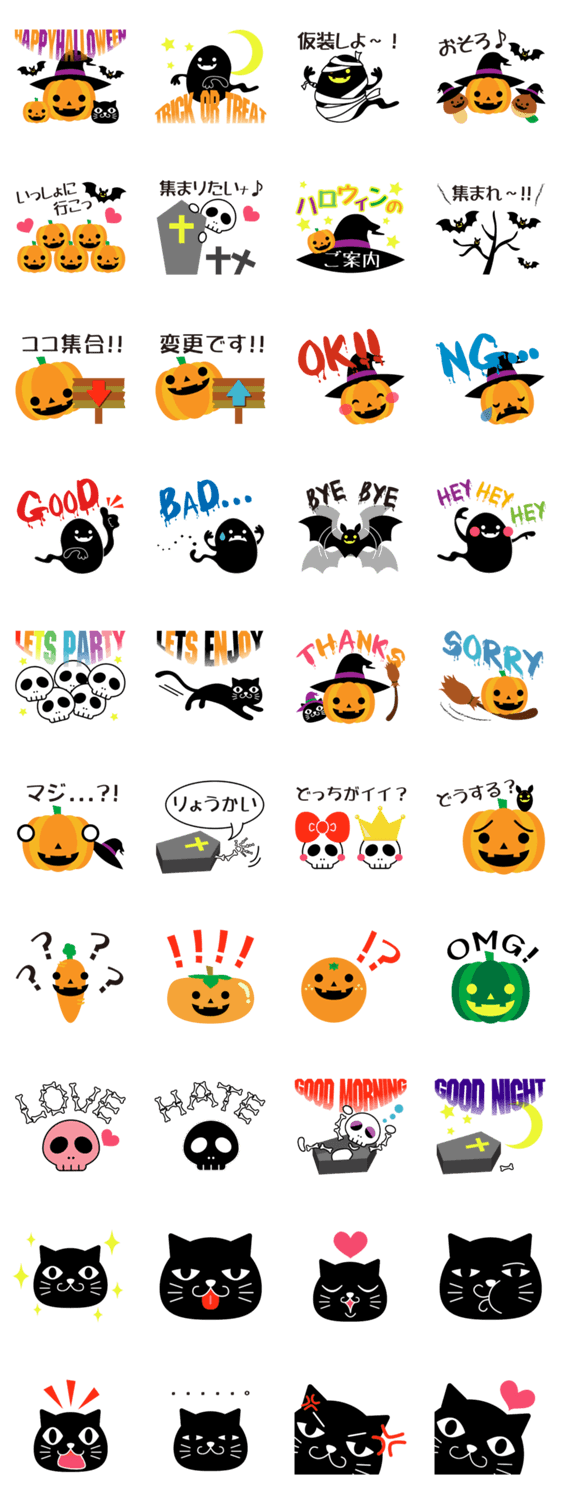 ハロウィンのための仮装のお誘いや連絡に!可愛すぎずシンプルなジャックオーランタンやガイコツ・おばけ・黒猫ちゃんの、普段使いもOKなスタンプです。