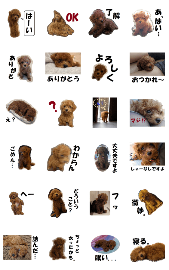 トイプードルの子犬のスタンプ(写真)です。日常で使いやすい言葉と一緒に。