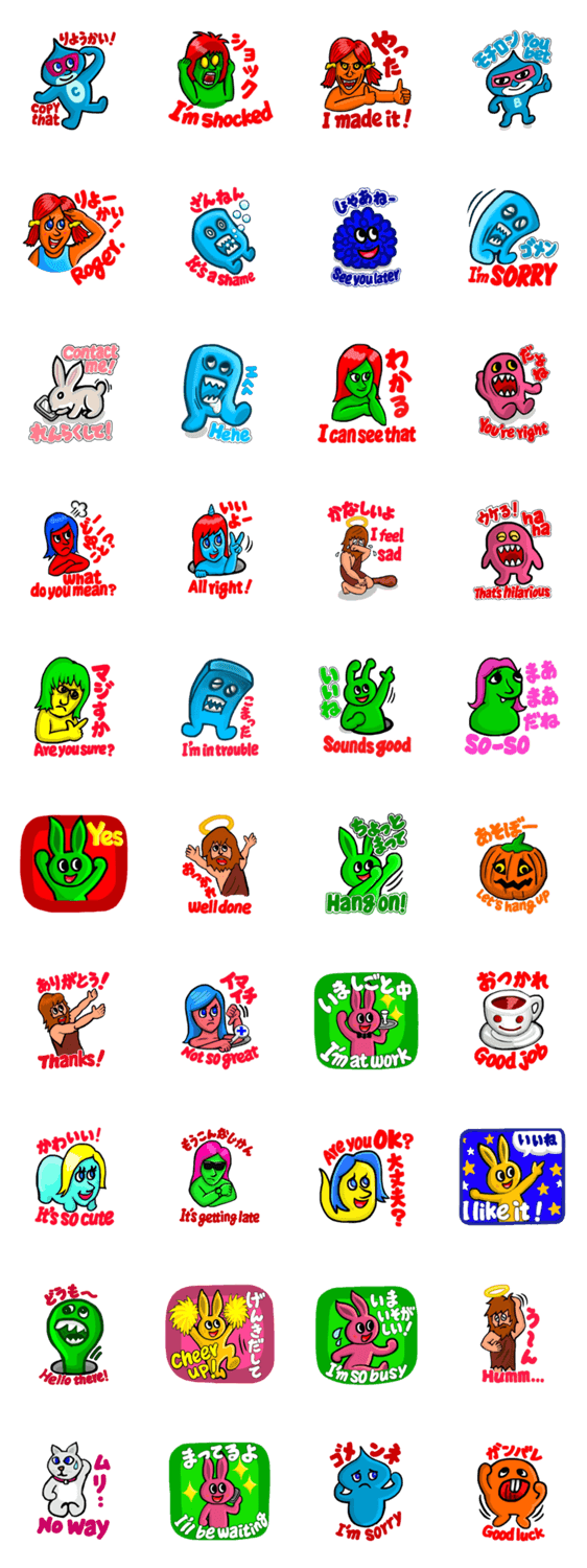 | スタンプ説明 | 色鮮やかな可愛いキャラクター達がすぐに役立つ40の英会話表現であなたの楽しいコミュニケーションを手伝ってくれます! |