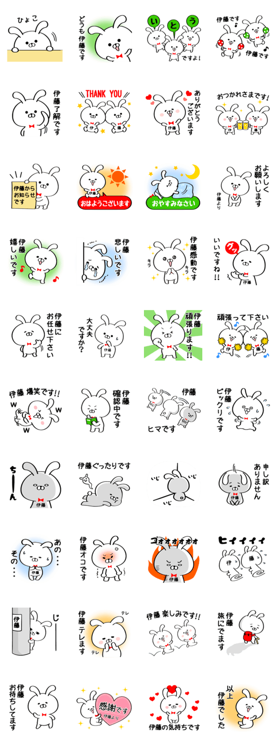 名字(苗字)伊藤(いとう)さんが使うウサギの名前スタンプです。仕事仲間にも使えるように敬語・ですます調になっています。