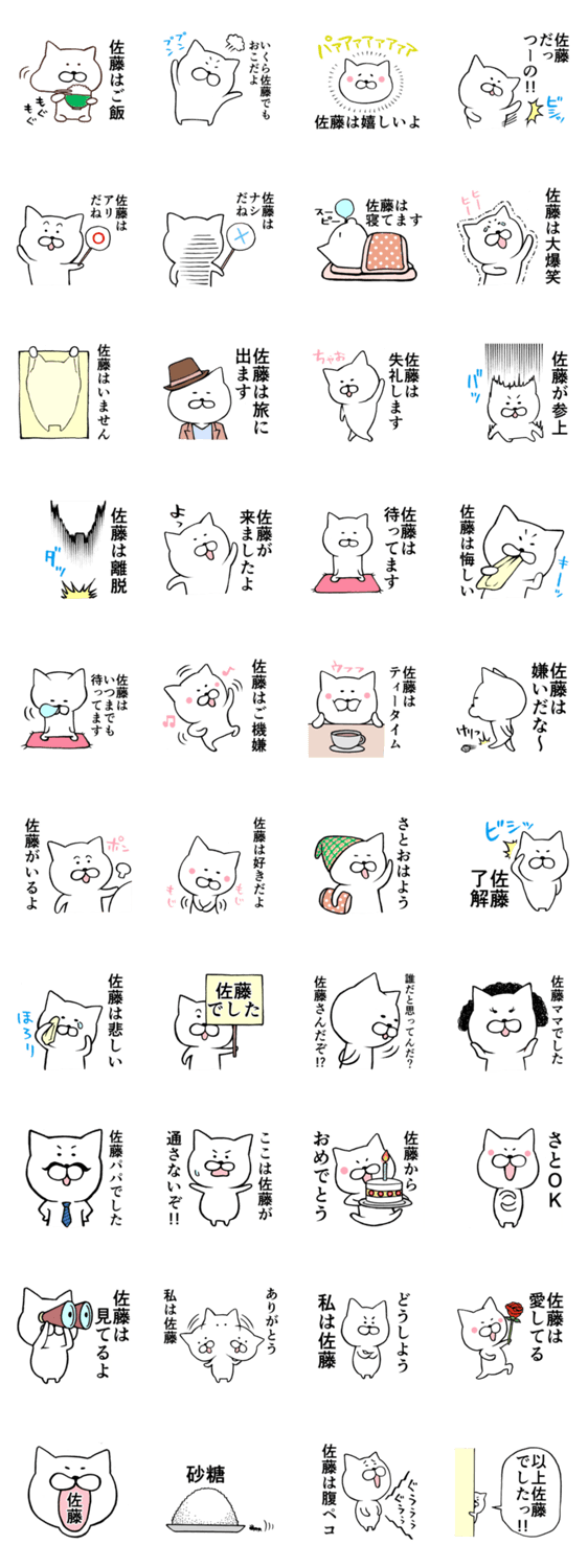 日本で一番多い苗字「佐藤(さとう)」のゆるくてかわいいネコのスタンプ。 鈴木でも高橋でも田中でもない。 私は佐藤だ!! さっちゃんだ!さとくんだ! そんなあなたに。