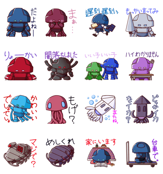 ブルマー型ロボットのブルマリネと、愉快な仲間たちのスタンプです。学校や職場、友達同士など、幅広くご利用いただけます。