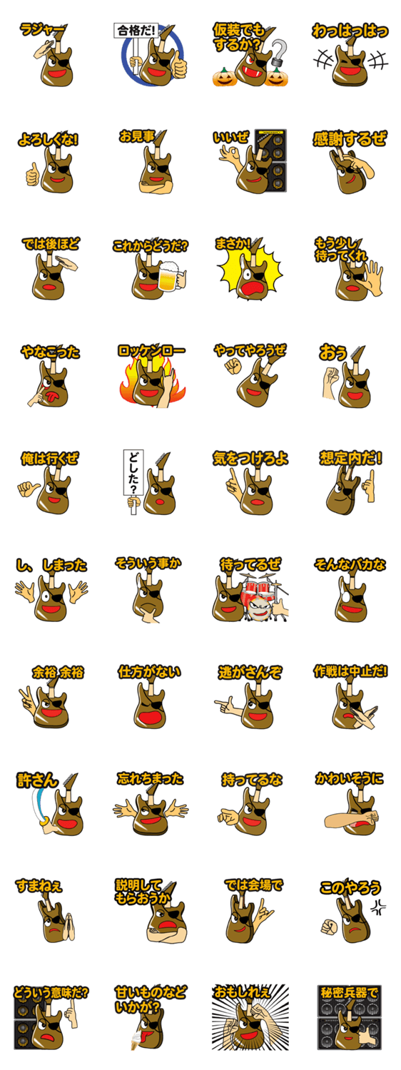 | スタンプ説明 | 片目のギタリーはドイツ系ロックバンドやジャーマンメタルのギターサウンドを好みます。そしてハロウィンや仮装も大好き。現在は海賊を辞め傭兵部隊の鬼軍曹として活躍中! |