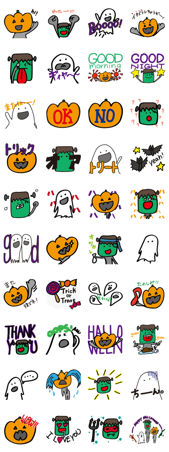 | スタンプ説明 | フランケン、パンプキン、ゴーストと愉快に楽しむスーパー最高なハロウィーン!これでハロウィンを思いっきり楽しんじゃお! |