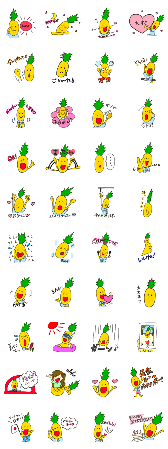 | スタンプ説明 | 日常で使えるおはよう、ありがとう、だいすきなどが詰まったポップで可愛いパイナップルBOY!たくさんつかってね! |
