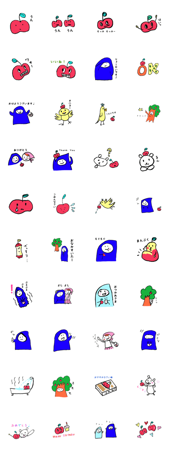 りんごとりんごのまわりで生活する子たちの日常スタンプです。