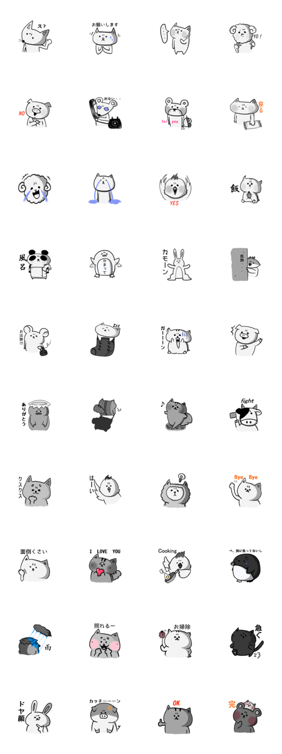 少し丸っこくて、眉間にシワがよってる可愛い動物たちのスタンプです。