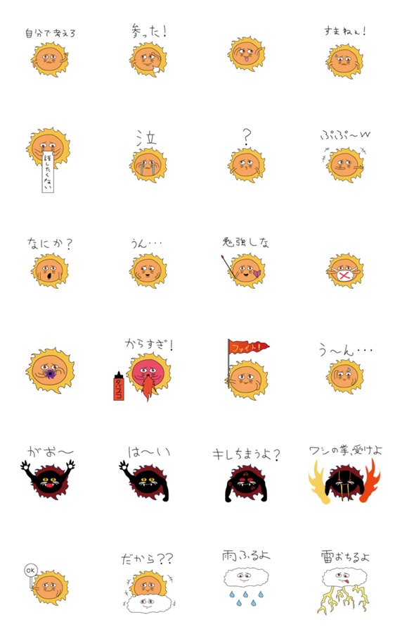 猫の髭のようなものが生えている太陽のスタンプです。 かわいいですが、常にムカつく表情をしております。