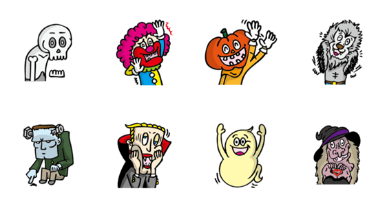 骸骨、ピエロ、カボチャ頭、狼男、フランケン、ドラキュラ、お化け、魔女だよ。可愛く作りました。楽しく使ってね。