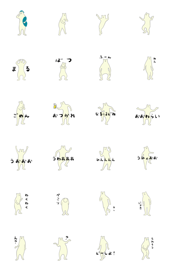 シロクマがぜんしんでかんじょうをひょうげんします。 "けたたましくうごくクマ"くんのともだちです。