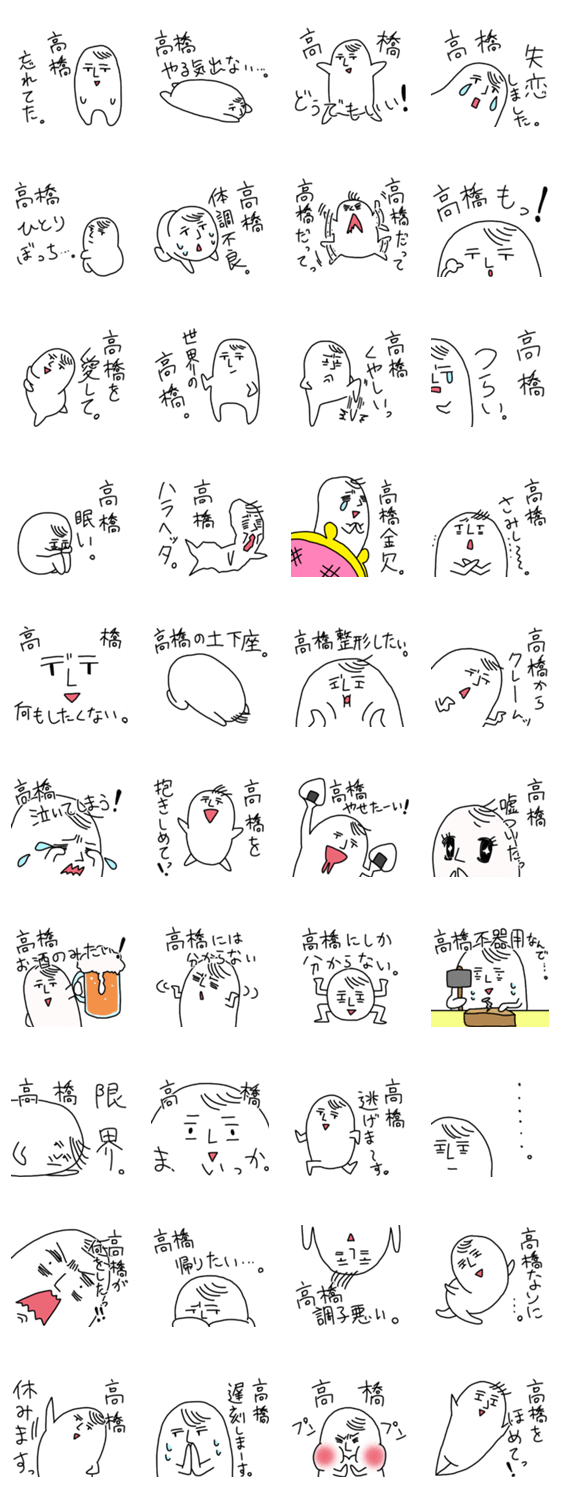 | スタンプ説明 | 高橋の中でもダメな高橋さん、そんなダメな高橋さんぴったりのスタンプ、ダメな高橋専用、ダメな高橋さんに送ってもよし!ダメな〇〇さん(中村、鈴木 、佐藤)シリーズ |
