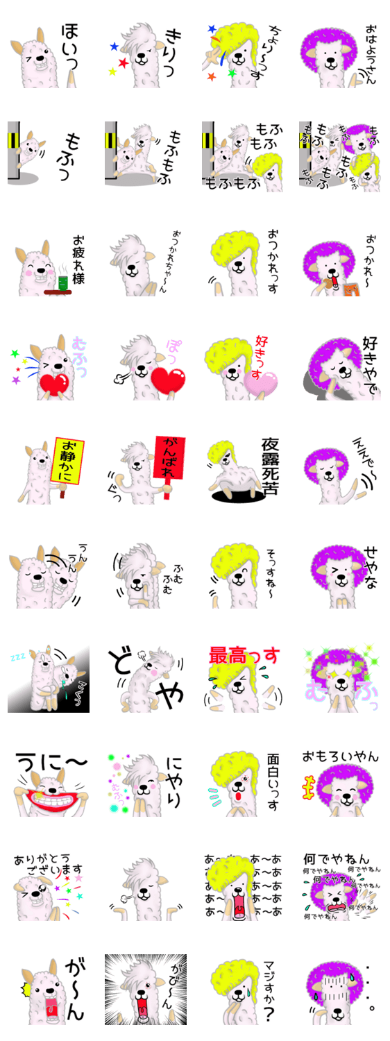 アルパカのあるぱきゃ。普通のアルパカ、イケメンアルパカ、ヤンキーアルパカ、おばちゃんアルパカの4人です。