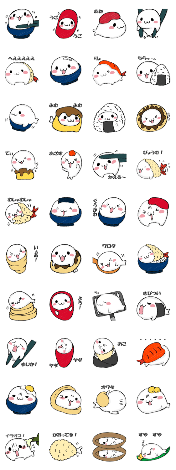 ゆるい顔のあざらしさん。海老天、お寿司、ドーナツ、プリン、めんたいこなどいろいろな食べ物になります。毎日の会話で簡単に使えるスタンプばかりです。