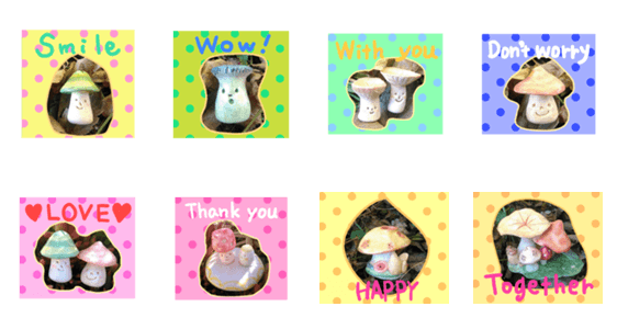 紙粘土で作ったきのこたちの写真をスタンプにしました