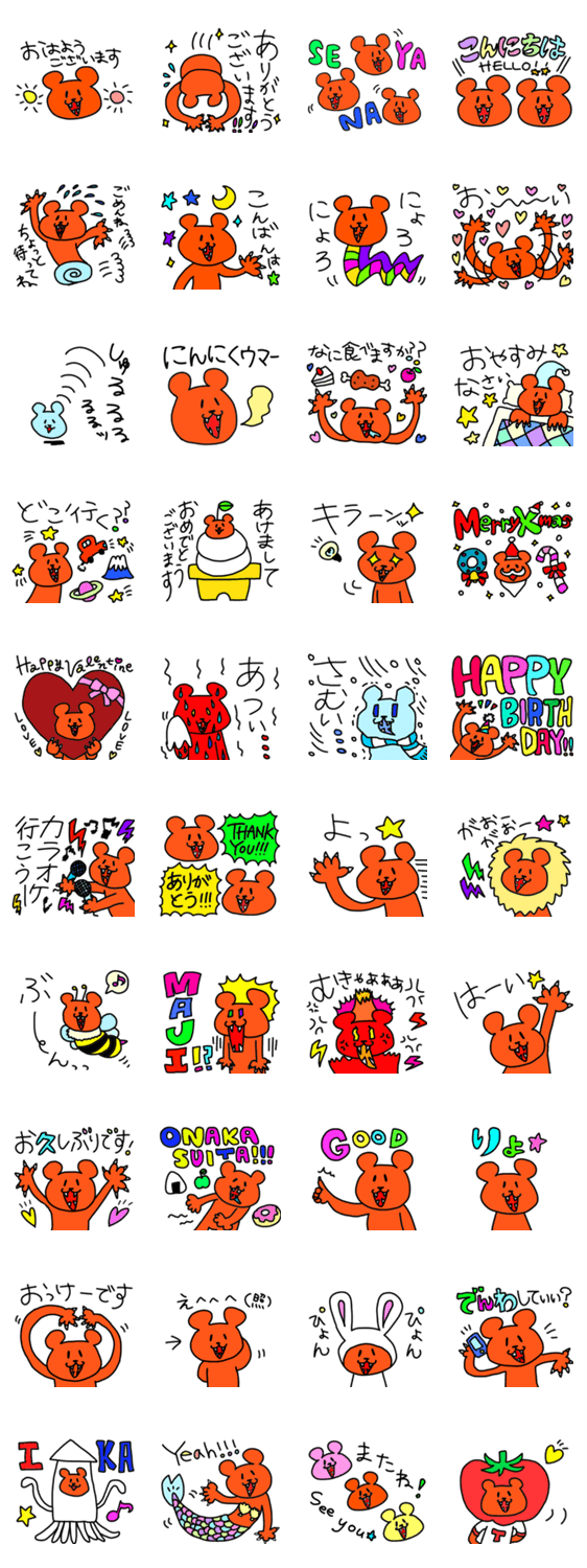 | スタンプ説明 | 敬語もタメ語も両方あります!!元気いっぱいハイテンションくまくまのLINEスタンプです!! |