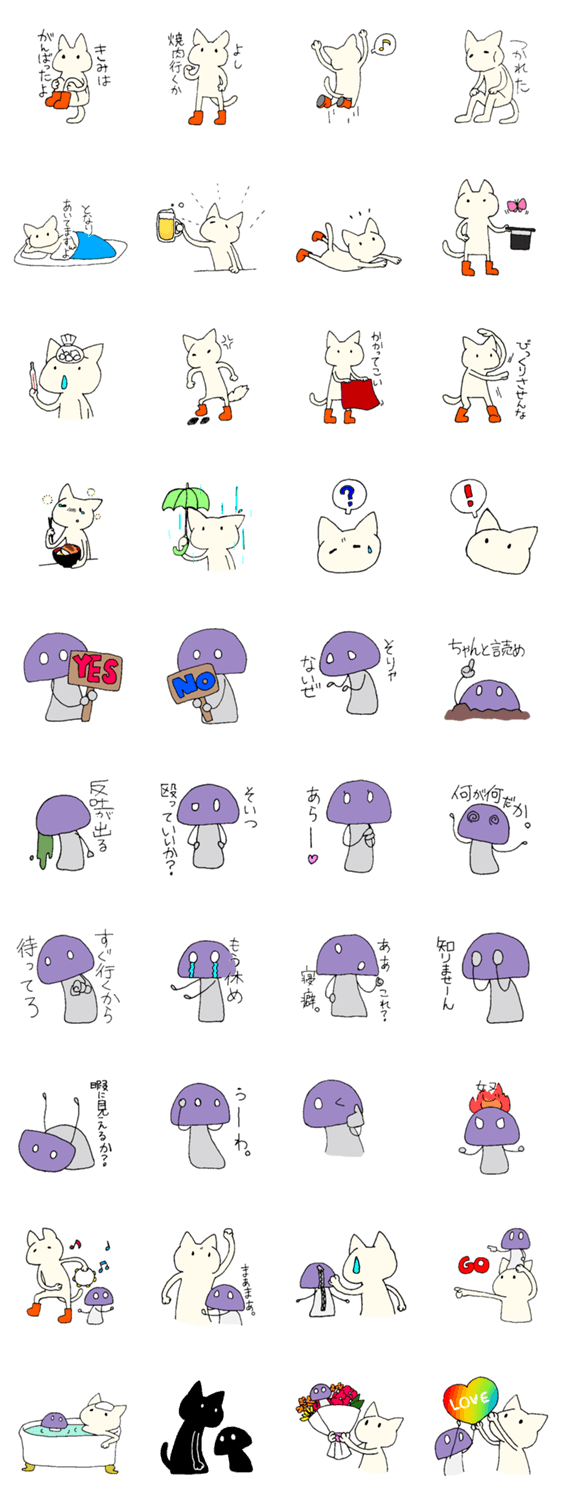 ちょっぴり気弱なねこと頼れるきのこのスタンプです。