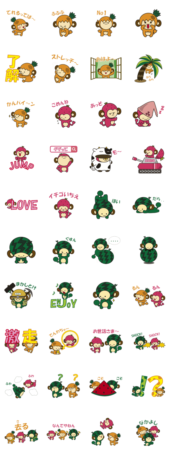 | スタンプ説明 | フルざるのスタンプ第三弾です。使いやすさをさらにUPさせ、様々なシーンに活用できます。 「パイン」「イチゴ」「スイカ」の三人組! |