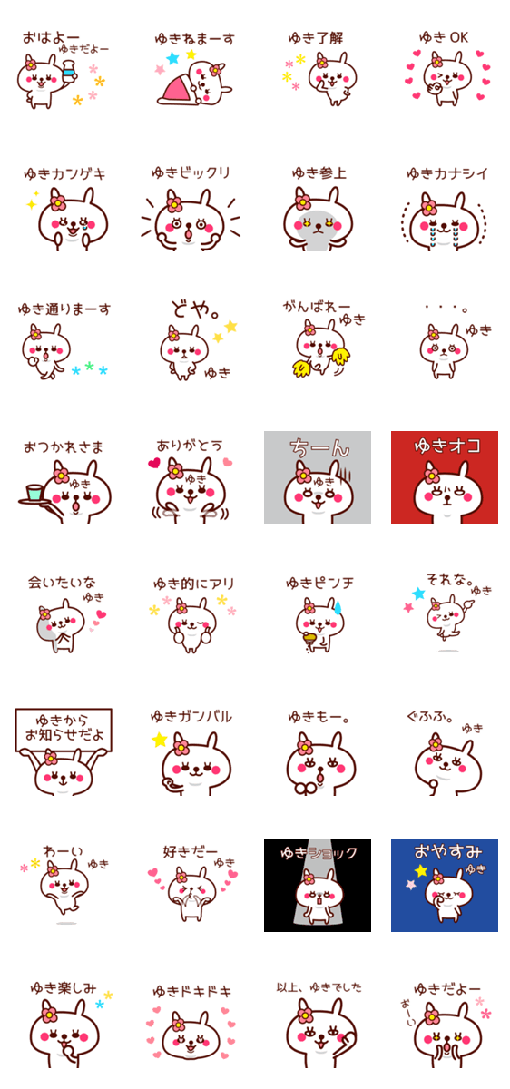 | スタンプ説明 | 「ゆき」ちゃん専用スタンプ♪名前、呼び名が「ゆき」ご本人はもちろん、「ゆき」ちゃんへのプレゼントにもどうぞ! |
